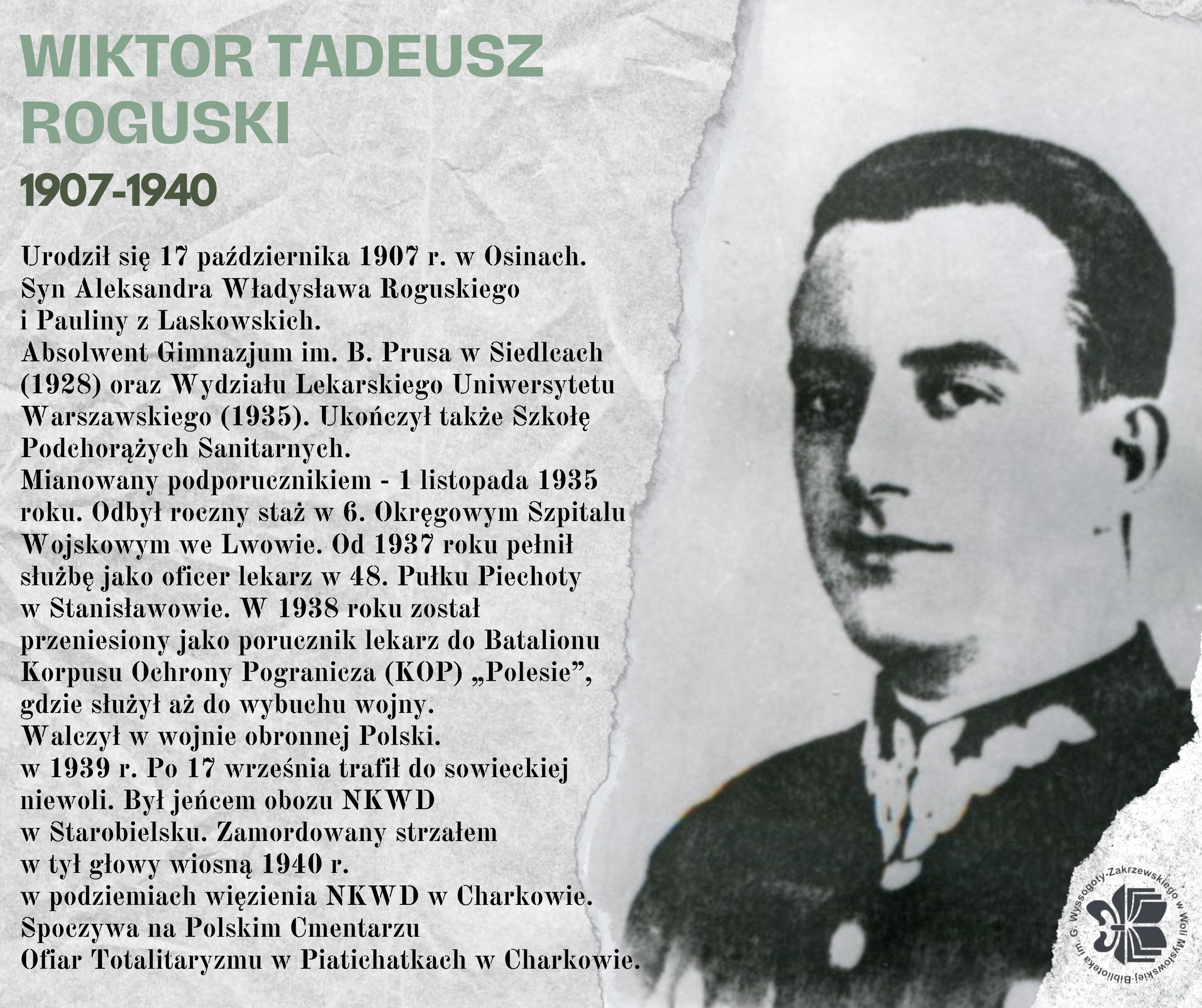 Porucznik lekarz Wiktor Tadeusz Roguski urodził się 17 października 1907 roku w Osinach. Był synem Aleksandra Władysława i Pauliny z Laskowskich. Ukończył Gimnazjum im. Bolesława Prusa w Siedlcach, Szkołę Podchorążych Rezerwy Piechoty, a następnie Wydział Lekarski Uniwersytetu Warszawskiego. W 1935 roku został podporucznikiem służby zdrowia Wojska Polskiego i pełnił służbę jako lekarz wojskowy m.in. w 48 Pułku Piechoty oraz w Korpusie Ochrony Pogranicza „Polesie”. Brał udział w kampanii wrześniowej 1939 roku, po czym trafił do niewoli sowieckiej i został osadzony w obozie w Starobielsku. Wiosną 1940 roku został zamordowany w Charkowie i spoczywa na Polskim Cmentarzu Ofiar Totalitaryzmu w Piatichatkach. Natomiast jego symboliczna mogiła znajduje się na Cmentarzu Centralnym w Siedlcach, w grobowcu rodzinnym. Jego nazwisko zostało również upamiętnione na tablicach katyńskich w Siedlcach, m.in. przy kościele pw. św. Stanisława.