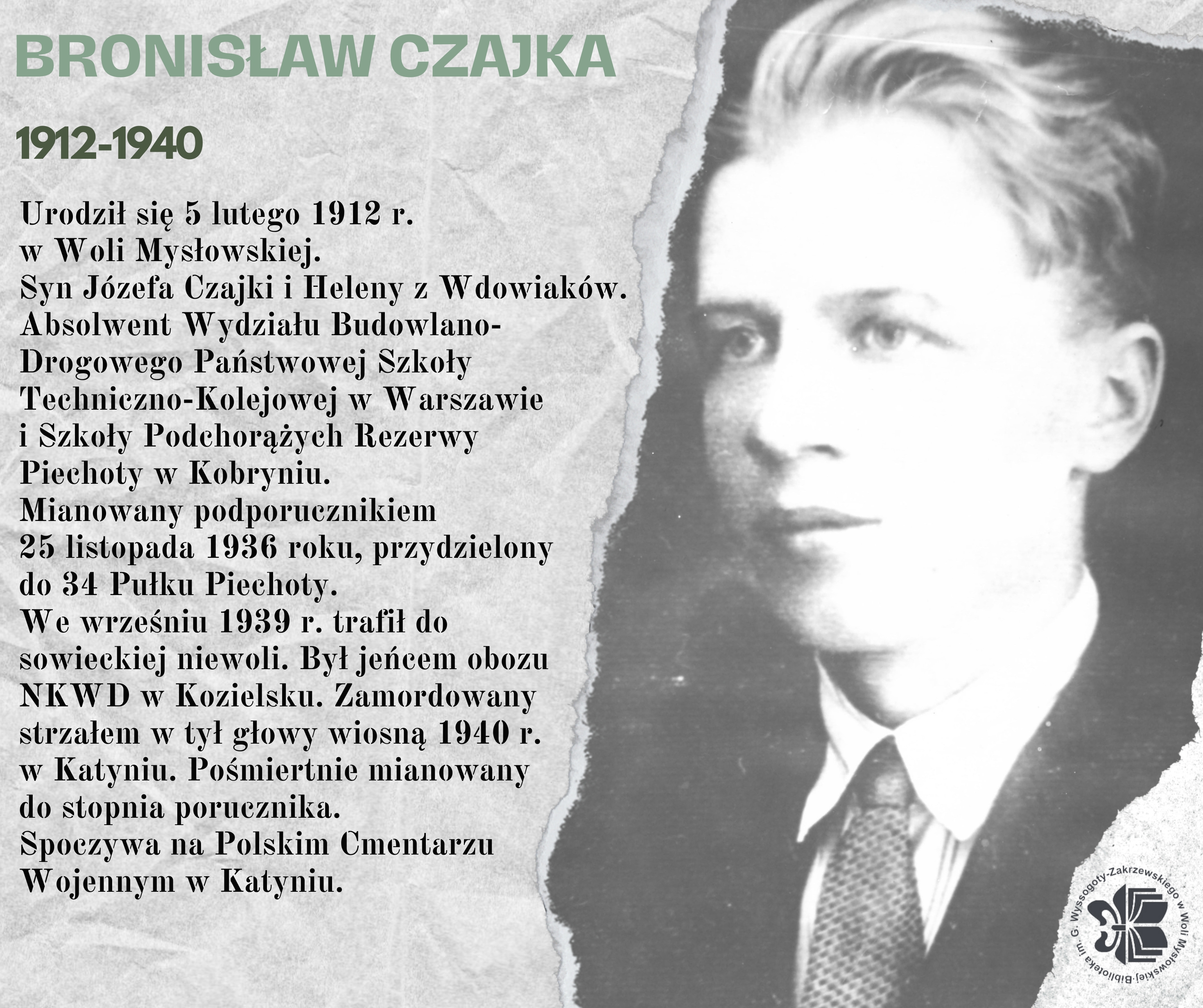 Porucznik Bronisław Czajka urodził się 5 lutego 1912 roku w Woli Mysłowskiej, był synem Józefa i Heleny z domu Wdowiak. Ukończył Wydział Budowlano-Drogowy Państwowej Szkoły Techniczno-Kolejowej w Warszawie oraz Szkołę Podchorążych Rezerwy Piechoty w Kobryniu. W 1936 roku został mianowany podporucznikiem i przydzielony do 34 Pułku Piechoty. We wrześniu 1939 roku walczył w obronie Ojczyzny, a po agresji Związku Sowieckiego trafił do niewoli i został osadzony w obozie NKWD w Kozielsku. Wiosną 1940 roku został zamordowany w Katyniu strzałem w tył głowy. Spoczywa na Polskim Cmentarzu Wojennym w Katyniu, a jego pamięć jest żywa także wśród lokalnej społeczności – jego nazwisko widnieje na tablicy pamiątkowej przy wejściu do kościoła w Wilczyskach, a na miejscowym cmentarzu w rodzinnym grobowcu znajduje się symboliczna mogiła z ziemią katyńską.